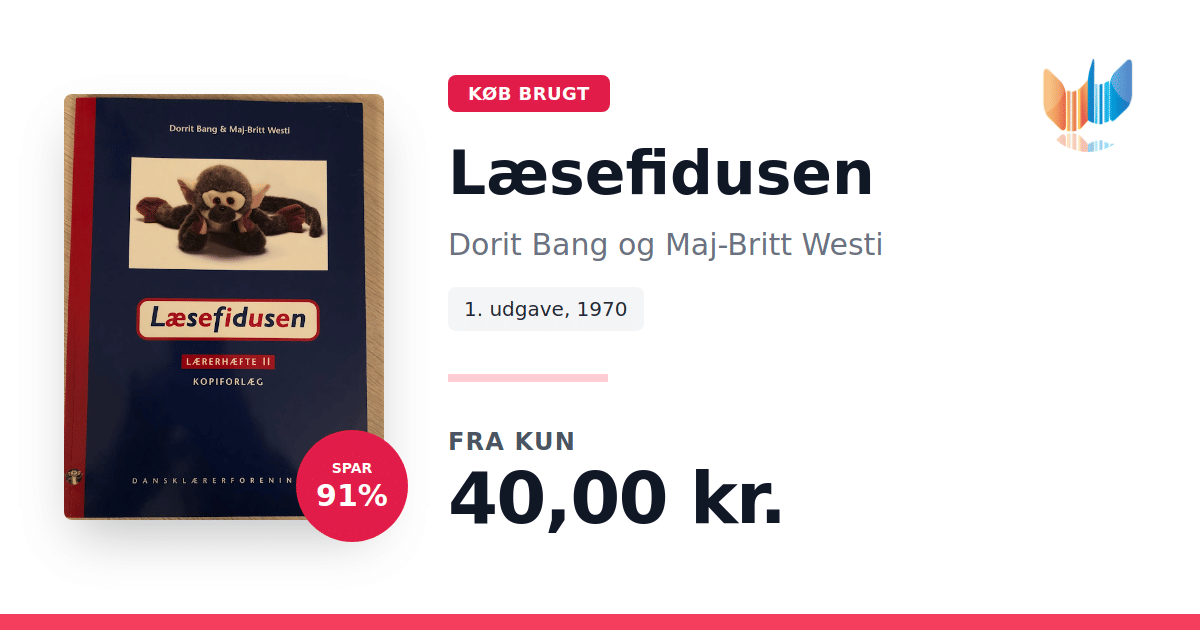 Lige nu kan du købe "Læsefidusen" af Dorit Bang og Maj-Britt Westi til kun 40,00 kr. Du sparer hele 91% af nyprisen! Bogen du ser her er brugt, og i perfekt stand. Vi har i øjeblikket 2 eksemplarer til salg af "Læsefidusen", så husk at se de forskellige udgaver.