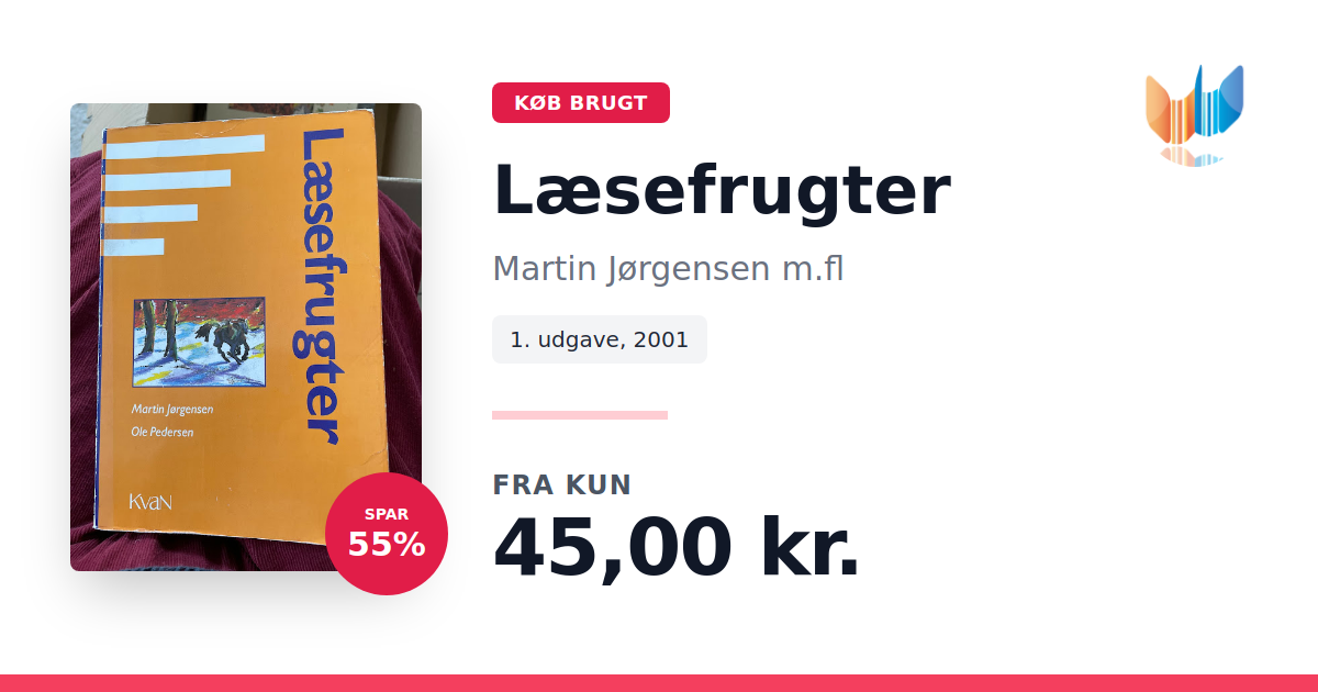 Lige nu kan du købe "Læsefrugter" af Martin Jørgensen m.fl til kun 45,00 kr. Du sparer hele 55% af nyprisen! Bogen du ser her er brugt, og i god stand. Vi har i øjeblikket 5 eksemplarer til salg af "Læsefrugter", så husk at se de forskellige udgaver.