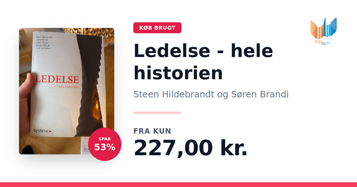 Lige nu kan du købe "Ledelse - hele historien" af Steen Hildebrandt og Søren Brandi til kun 227,00 kr. Du sparer hele 53% af nyprisen! Bogen du ser her er brugt, og i god stand. Vi har i øjeblikket 3 eksemplarer til salg af "Ledelse - hele historien", så husk at se de forskellige udgaver.