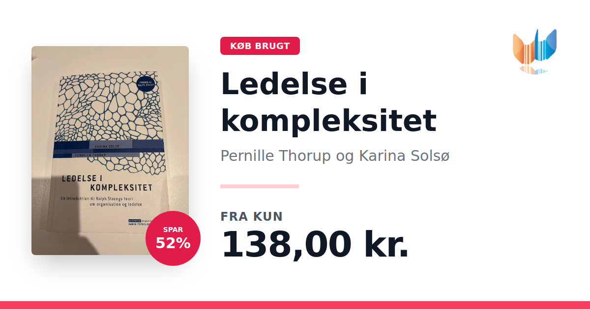Lige nu kan du købe "Ledelse i kompleksitet" af Pernille Thorup og Karina Solsø til kun 138,00 kr. Du sparer hele 52% af nyprisen! Bogen du ser her er brugt, og i god stand. Vi har i øjeblikket kun et enkelt eksemplar til salg af "Ledelse i kompleksitet", så slå til mens du kan!