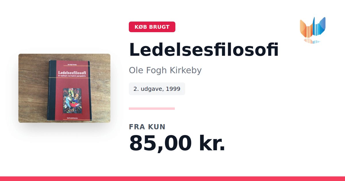 Lige nu kan du købe "Ledelsesfilosofi" af Ole Fogh Kirkeby til kun 85,00 kr. Bogen du ser her er brugt, og i perfekt stand. Vi har i øjeblikket kun et enkelt eksemplar til salg af "Ledelsesfilosofi", så slå til mens du kan!