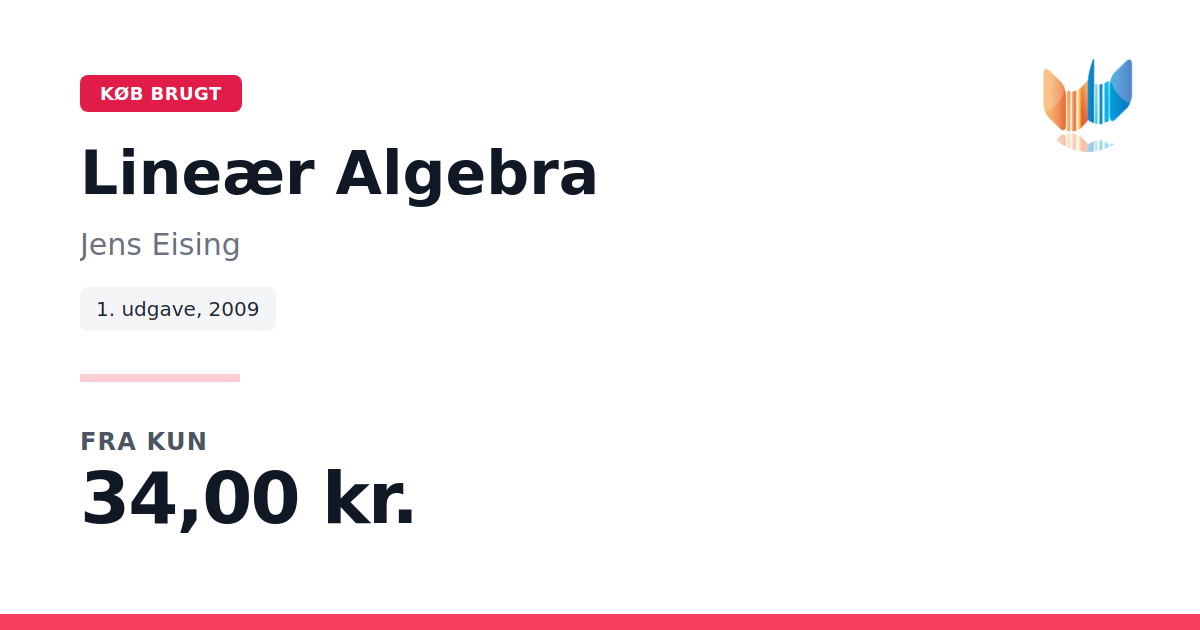 Lige nu kan du købe "Lineær Algebra" af Jens Eising til kun 34,00 kr. Du sparer hele 66% af nyprisen! Bogen du ser her er brugt, og i perfekt stand. Vi har i øjeblikket 3 eksemplarer til salg af "Lineær Algebra", så husk at se de forskellige udgaver.