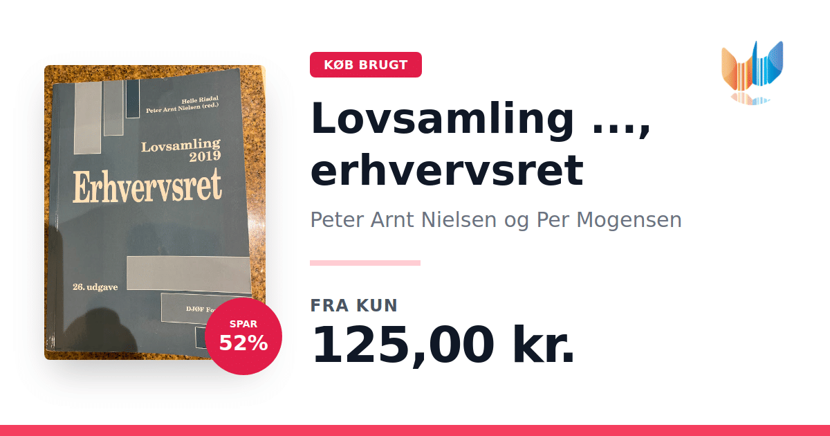 Lige nu kan du købe "Lovsamling ..., erhvervsret" af Peter Arnt Nielsen og Per Mogensen til kun 125,00 kr. Du sparer hele 52% af nyprisen! Bogen du ser her er brugt, og i god stand. Vi har i øjeblikket 2 eksemplarer til salg af "Lovsamling ..., erhvervsret", så husk at se de forskellige udgaver.