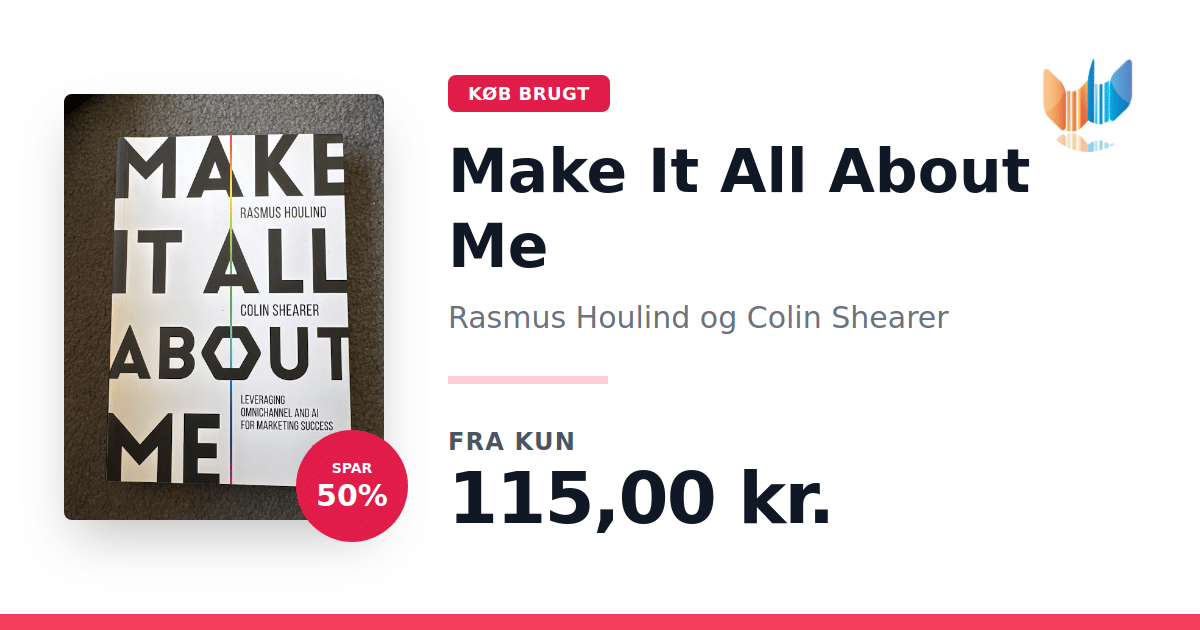 Lige nu kan du købe "Make It All About Me" af Rasmus Houlind og Colin Shearer til kun 115,00 kr. Du sparer hele 50% af nyprisen! Bogen du ser her er brugt, og i perfekt stand. Vi har i øjeblikket kun et enkelt eksemplar til salg af "Make It All About Me", så slå til mens du kan!