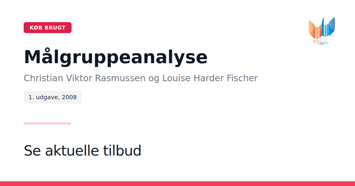 Målgruppeanalyse giver en dybdegående introduktion til, hvordan man professionelt kan afklare, om et nyt produkt – hvad enten det er en kaffekande, en hjemmeside, en tøjkollektion eller en sundhedskampagne – vil blive modtaget af den tiltænkte kunde eller bruger. Bogen forklarer, hvordan en målgruppeanalyse både kan informere produktudviklingen og danne grundlag for virksomhedens eller organisationens kommunikationsstrategi ved lanceringen af et nyt produkt. Forfatterne Christian Viktor Rasmussen og Louise Harder Fischer præsenterer en række teoretiske og metodiske redskaber, som understøtter udførelsen af en vellykket målgruppeanalyse, samtidig med at de diskuterer de praktiske udfordringer, analytikere kan støde på. Med indslag af illustrative cases er denne bog et værdifuldt redskab for studerende inden for kommunikation, markedsføring og produktudvikling samt for professionelle, der ønsker at opnå en dybere forståelse af deres målgruppe.