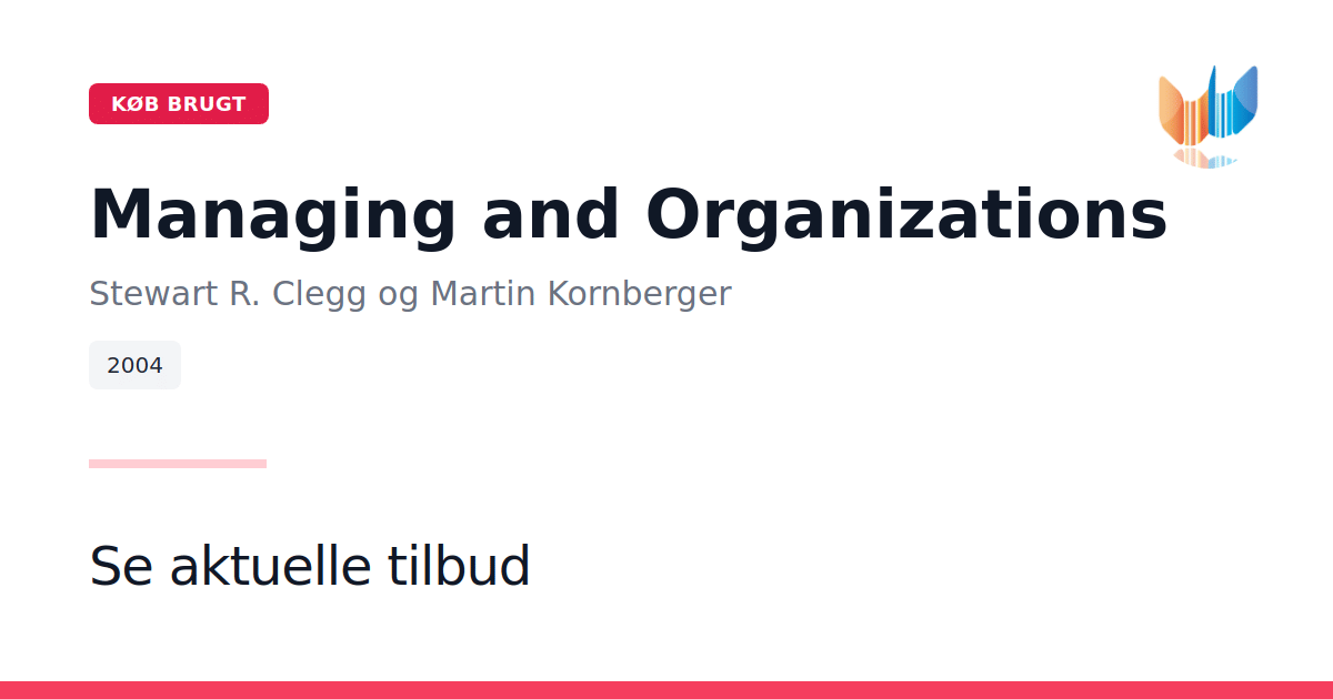 Managing and Organizations: An Introduction to Theory and Practice (2004) af Stewart R. Clegg, Martin Kornberger og Tyrone S. Pitsis er en omfattende, engagerende og lettilgængelig introduktion til moderne organisering og ledelse. Udgivet af SAGE Publications som paperback på 584 sider, kombinerer bogen de nyeste teoretiske perspektiver med konkrete praksiseksempler. Forfatterne fører læseren gennem organisationsteori, organisationsadfærd og forretningsstrategi og giver et helhedsblik på, hvordan teori omsættes til daglig ledelsespraksis. Med fokus på aktuelle forandringer og tendenser udfoldes både fagenes historie og de nyeste udviklingsretninger. Bogen benytter vignetter fra film, romaner og aviser til at illustrere nøgletemaer og væsentlige dilemmaer i nutidens organisationer. Denne metode skaber genkendelse og fremmer refleksion over de komplekse kræfter, der præger moderne arbejdspladser. Nøglefunktioner: - Bred dækning af generelle ledelsestemaer - Tilgængelig introduktion til centrale teorier - Kombination af historisk overblik og nutidig state of the art - Forslag til videre læsning og læringstjek - Pædagogiske værktøjer i form af tabeller, figurer og læringsbokse Managing and Organizations er ideel for studerende og undervisere inden for ledelse, organisationsstudier og organisationsadfærd. Med sin balancerede kombination af teori og praksis inspirerer bogen til kritisk tænkning, velbegrundet handling og videre udforskning af faget.