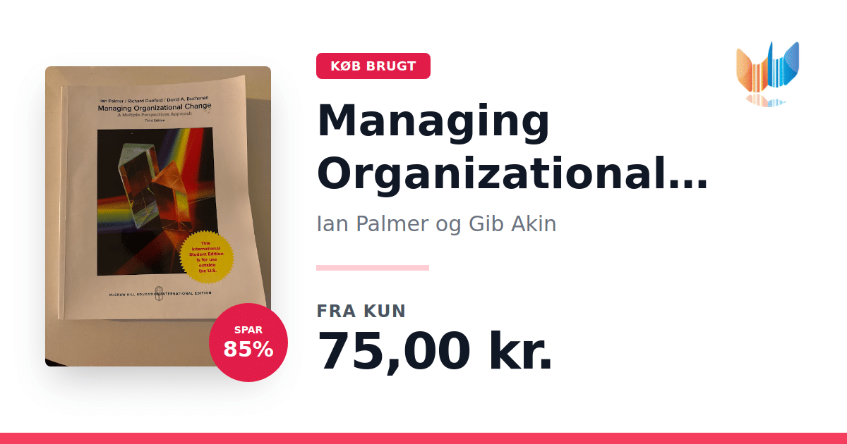 Lige nu kan du købe "Managing Organizational Change: A Multiple Perspectives Approach" af Ian Palmer og Gib Akin til kun 75,00 kr. Du sparer hele 85% af nyprisen! Bogen du ser her er brugt, og i god stand. Vi har i øjeblikket 2 eksemplarer til salg af "Managing Organizational Change: A Multiple Perspectives Approach", så husk at se de forskellige udgaver.
