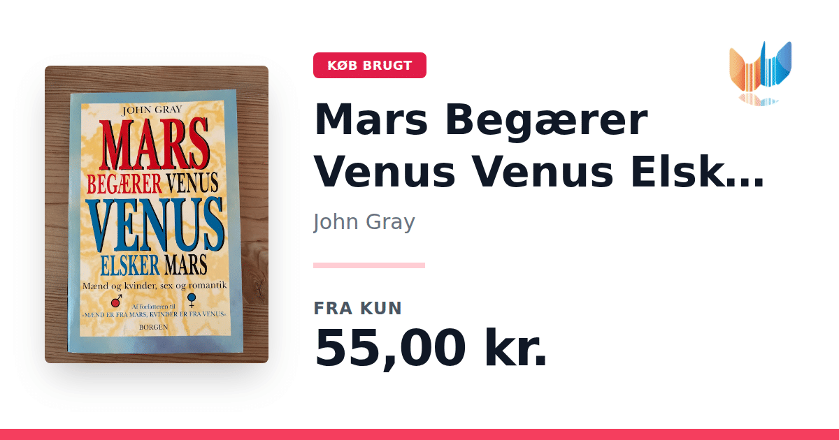 Lige nu kan du købe "Mars Begærer Venus Venus Elsker Mars" af John Gray til kun 55,00 kr. Bogen du ser her er brugt, og i god stand. Vi har i øjeblikket kun et enkelt eksemplar til salg af "Mars begærer Venus, Venus elsker Mars", så slå til mens du kan!