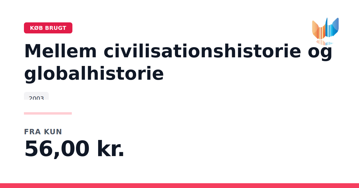 Lige nu kan du købe "Mellem civilisationshistorie og globalhistorie" til kun 56,00 kr. Bogen du ser her er brugt, og i perfekt stand. Vi har i øjeblikket kun et enkelt eksemplar til salg af "Mellem civilisationshistorie og globalhistorie", så slå til mens du kan!