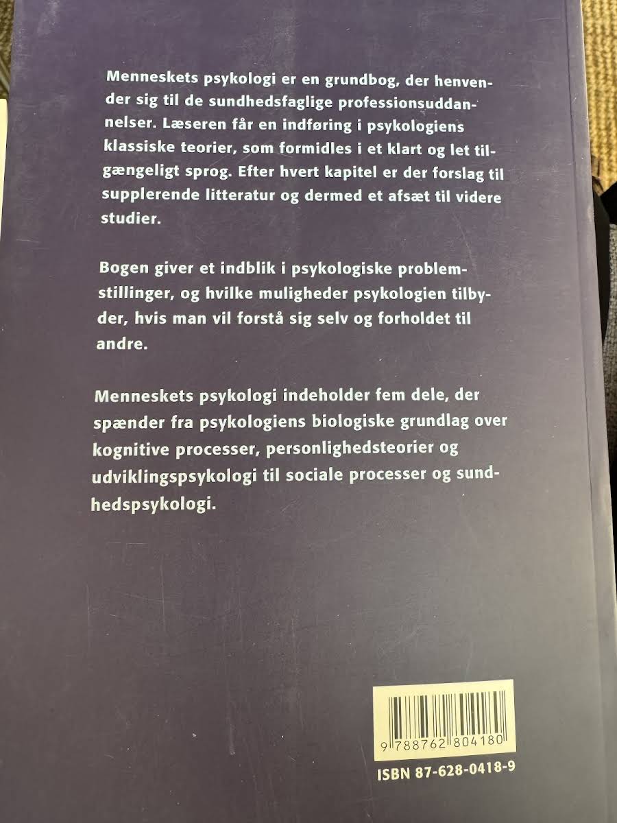 Menneskets psykologi er en grundbog udviklet til studerende inden for de sundhedsfaglige professionsuddannelser. Bogen præsenterer psykologiens klassiske teorier i et klart og overskueligt sprog, som gør emnet tilgængeligt for både nye og erfarne læsere. Hvert kapitel afsluttes med forslag til supplerende litteratur, der opfordrer til videre studier og en dybere forståelse af faget. Strukturen i bogen er inddelt i fem dele, der omfatter alt fra det biologiske grundlag og kognitive processer til personligheds- og udviklingspsykologi samt sociale processer og sundhedspsykologi. Ved at give et indblik i centrale psykologiske problemstillinger, tilbyder Menneskets psykologi læseren redskaber til at forstå sig selv og relationerne til andre mennesker.
