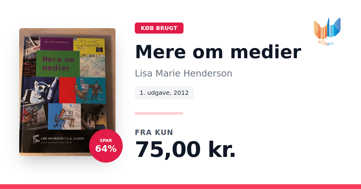 Lige nu kan du købe "Mere om medier" af Lisa Marie Henderson til kun 75,00 kr. Du sparer hele 64% af nyprisen! Bogen du ser her er brugt, og i perfekt stand. Vi har i øjeblikket kun et enkelt eksemplar til salg af "Mere om medier", så slå til mens du kan!