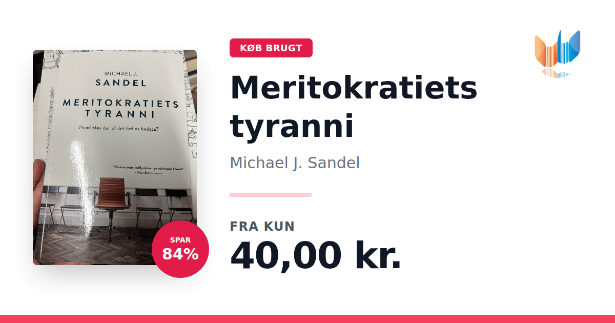 Lige nu kan du købe "Meritokratiets tyranni" af Michael J. Sandel til kun 40,00 kr. Du sparer hele 84% af nyprisen! Bogen du ser her er brugt, og i god stand. Vi har i øjeblikket kun et enkelt eksemplar til salg af "Meritokratiets tyranni", så slå til mens du kan!