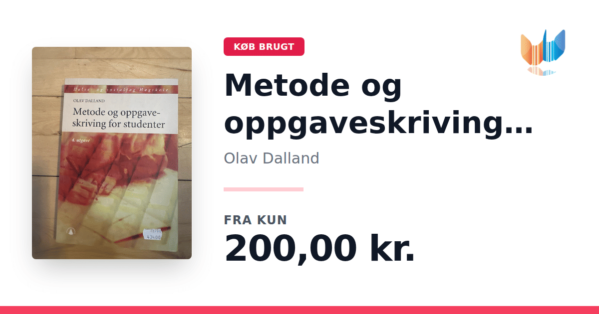 Lige nu kan du købe "Metode og oppgaveskriving for studenter" af Olav Dalland til kun 200,00 kr. Bogen du ser her er brugt, og i perfekt stand. Vi har i øjeblikket kun et enkelt eksemplar til salg af "Metode og oppgaveskriving for studenter", så slå til mens du kan!