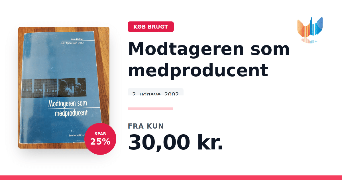 Lige nu kan du købe "Modtageren som medproducent" til kun 30,00 kr. Du sparer hele 25% af nyprisen! Bogen du ser her er brugt, og i god stand. Vi har i øjeblikket kun et enkelt eksemplar til salg af "Modtageren som medproducent", så slå til mens du kan!