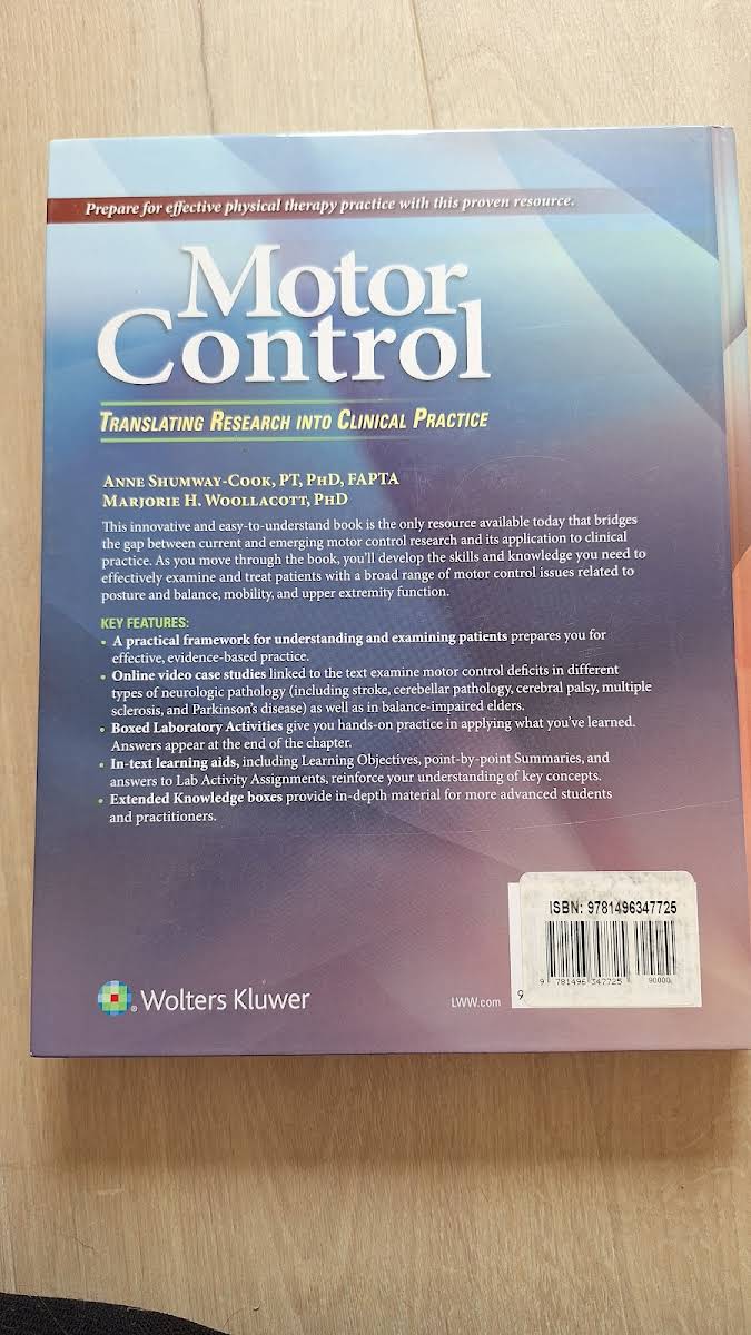 Motor Control: Translating Research into Clinical Practice (2016) af Anne Shumway-Cook og Marjorie H. Woollacott er det eneste omfattende værk, der bygger bro mellem aktuel motorisk kontrol‐forskning og dens direkte anvendelse i klinisk praksis. Udgivet af Lippincott Williams & Wilkins som hardcover på 640 sider, henvender bogen sig til alle, der ønsker at styrke deres kliniske beslutningsgrundlag med evidensbaserede metoder. Forfattet af to førende eksperter inden for neurologisk rehabilitering, guider bogen læseren gennem undersøgelse og behandling af patienter med udfordringer inden for postural kontrol, mobilitet og overekstremitetsfunktion. Fokus er på at omsætte teori til praksis med dokumenterede teknikker og redskaber. Hvert kapitel følger en ensartet struktur: først normal kontrolproces, dernæst aldersrelaterede ændringer, forskningsresultater vedrørende unormal funktion og til sidst kliniske anvendelser - herunder detaljerede metoder til undersøgelse og behandling af motorisk dyskontrol. Denne udgave er beriget med nyt pædagogisk materiale, supplerende instruktionsvideoer og separate kapitler, der belyser mobilitetsudvikling fra barndom til alderdom. Resultatet er et nutidigt referenceværk, der afspejler den hastige udvikling i feltet motorisk kontrol.