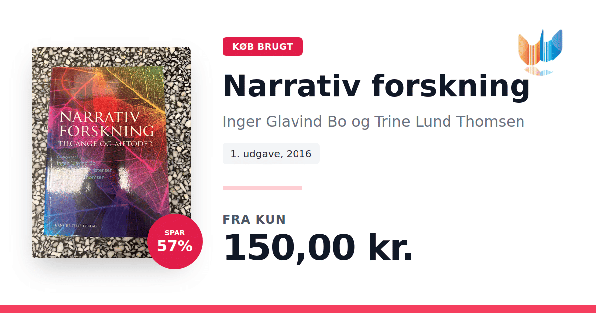 Lige nu kan du købe "Narrativ forskning" af Inger Glavind Bo og Trine Lund Thomsen til kun 150,00 kr. Du sparer hele 57% af nyprisen! Bogen du ser her er brugt, og i perfekt stand. Vi har i øjeblikket kun et enkelt eksemplar til salg af "Narrativ forskning", så slå til mens du kan!