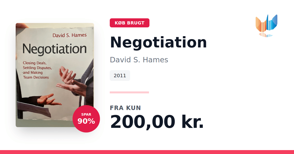 Negotiation - Closing Deals, Settling Disputes, and Making Team Decisions af David S. Hames (2011, SAGE Publications, 520 sider) giver et samlet overblik over de grundlæggende elementer i forhandlingsprocessen og de udfordringer, forhandlere står over for. Bogen kombinerer den nyeste teori og forskning med læsestykker fra forskellige perspektiver, så du får indblik i, hvordan forhandlinger både lykkes og fejler i praksis. Gennem cases får du mulighed for at analysere virkelige forhandlingssituationer, mens rollespil og øvelser hjælper dig med at styrke dine færdigheder. Spørgeskemaer med fokus på personlige egenskaber gør det desuden muligt selv at vurdere, hvordan din egen adfærd påvirker både processen og resultatet. Med dette værk får du både teoretiske redskaber og praktiske øvelser til at lukke aftaler, løse konflikter og træffe kvalificerede beslutninger i teams.