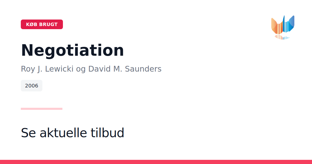 Negotiation af Roy J. Lewicki, David M. Saunders og Bruce Barry præsenterer de grundlæggende begreber og teorier inden for forhandlingspsykologi og konfliktløsning. Med klare modeller og analyser af både interpersonelle og intergruppe-dynamikker giver forfatterne en systematisk indføring i, hvordan man forstår og styrer forhandlingsprocesser. Bogen dækker alt fra forberedelse og informationsudveksling til strategier for gensidigt fordelagtige aftaler og håndtering af uoverensstemmelser. Praktiske værktøjer og cases illustrerer, hvordan man løser interessekonflikter og opbygger tillidsfulde relationer. Denne paperback-udgave fra 2006 strækker sig over 597 sider og henvender sig til studerende inden for ledelse, erhvervsøkonomi og HR-området - men er også et uundværligt opslagsværk for alle, der ønsker at forfine deres forhandlingsevner.