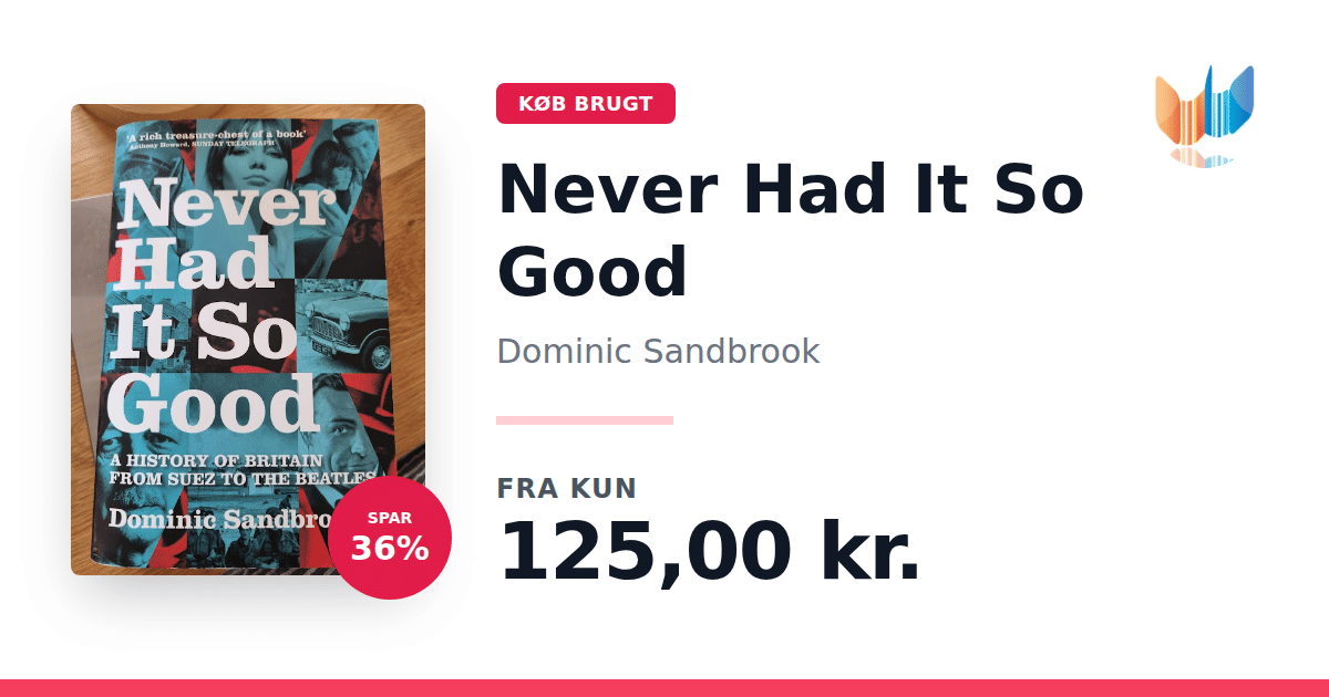 Lige nu kan du købe "Never Had It So Good" af Dominic Sandbrook til kun 125,00 kr. Du sparer hele 36% af nyprisen! Bogen du ser her er brugt, og i perfekt stand. Vi har i øjeblikket kun et enkelt eksemplar til salg af "Never Had It So Good", så slå til mens du kan!