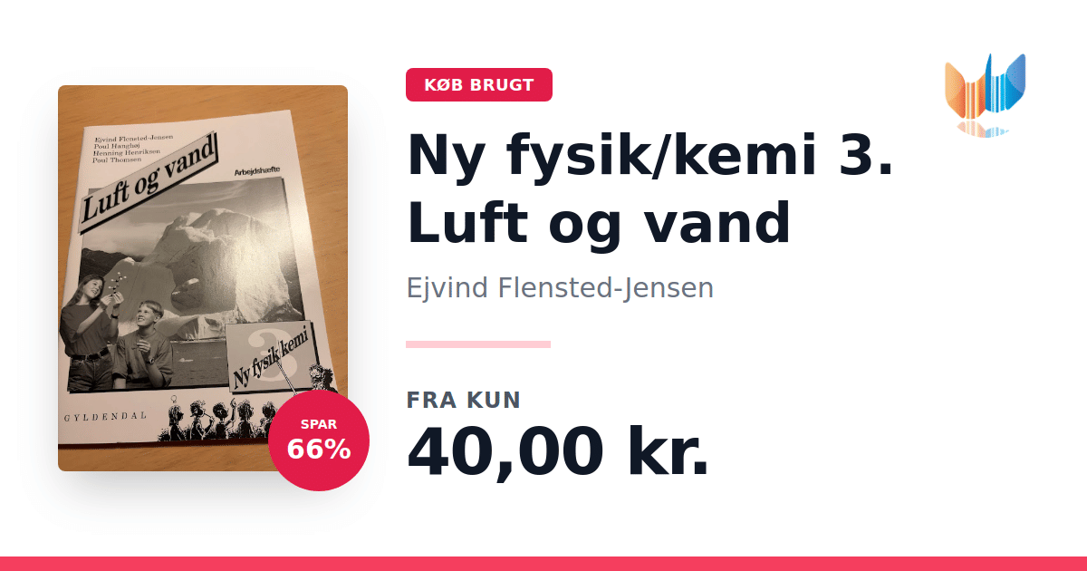 Lige nu kan du købe "Ny fysik/kemi 3. Luft og vand" af Ejvind Flensted-Jensen til kun 40,00 kr. Du sparer hele 66% af nyprisen! Bogen du ser her er brugt, og i slidt stand. Vi har i øjeblikket 2 eksemplarer til salg af "Ny fysik/kemi 3. Luft og vand", så husk at se de forskellige udgaver.