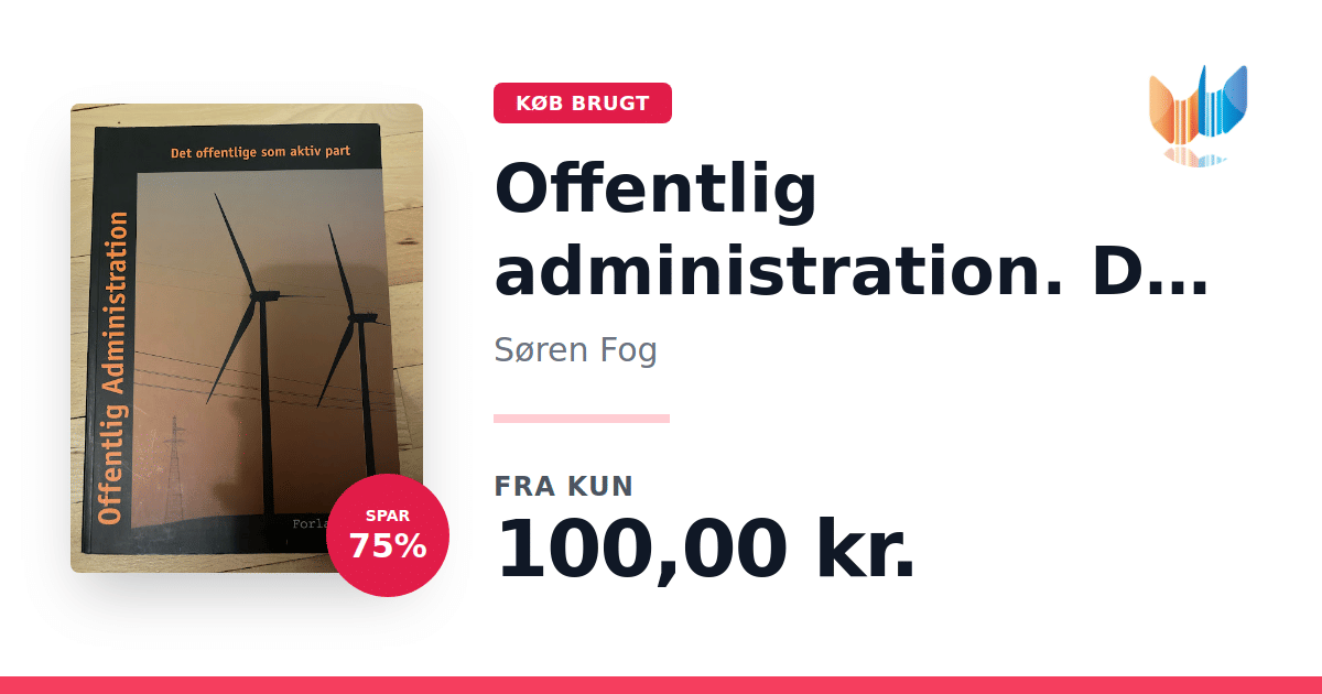 Lige nu kan du købe "Offentlig administration. Det offentlige som aktiv part" af Søren Fog til kun 100,00 kr. Du sparer hele 75% af nyprisen! Bogen du ser her er brugt, og i god stand. Vi har i øjeblikket 2 eksemplarer til salg af "Offentlig administration", så husk at se de forskellige udgaver.