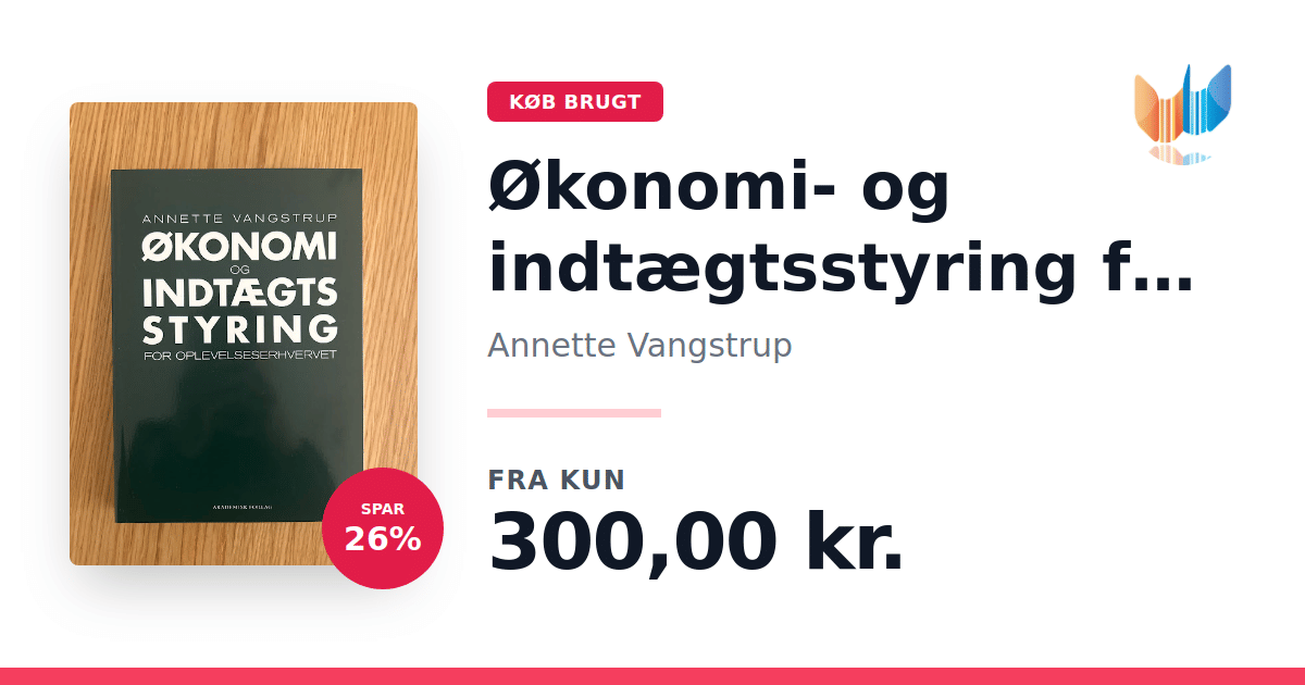 Lige nu kan du købe "Økonomi- og indtægtsstyring for oplevelseserhvervet" af Annette Vangstrup til kun 300,00 kr. Du sparer hele 26% af nyprisen! Bogen du ser her er brugt, og i perfekt stand. Vi har i øjeblikket kun et enkelt eksemplar til salg af "Økonomi- og indtægtsstyring for oplevelseserhvervet", så slå til mens du kan!
