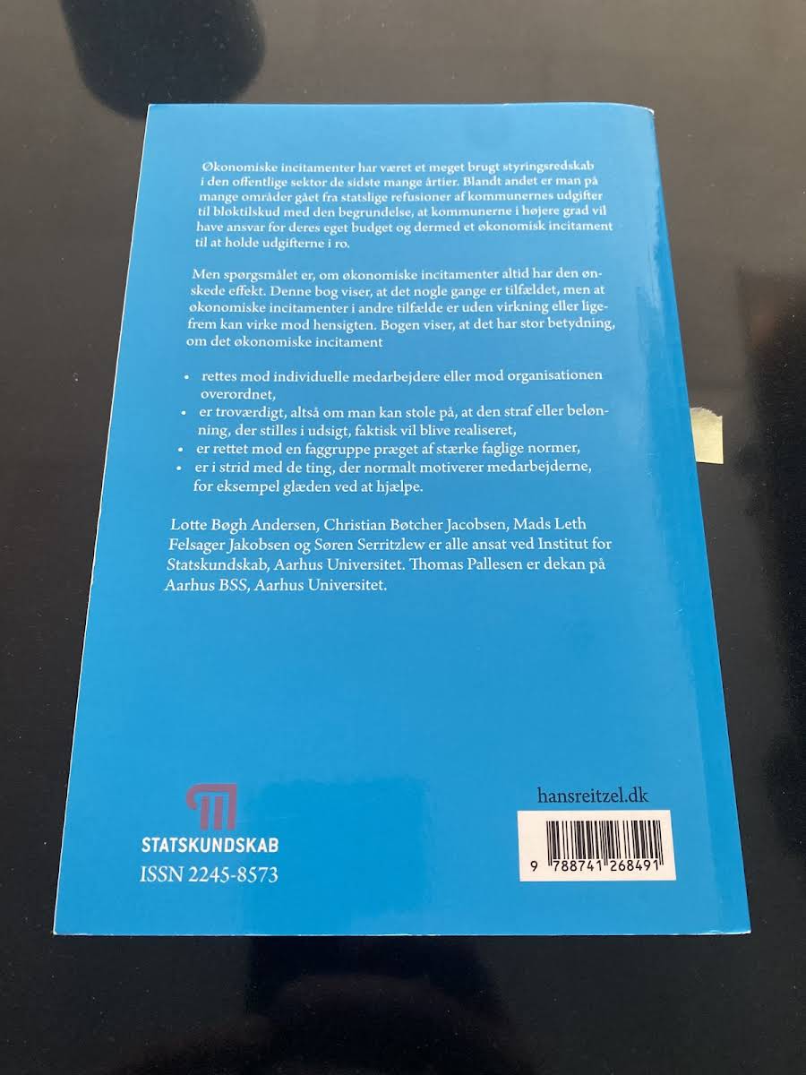 I "Økonomiske incitamenter i den offentlige sektor" foretager Thomas Pallesen, Lotte Bøgh Andersen, Søren Serritzlew, Mads Leth Felsager Jakobsen og Christian Bøtcher Jacobsen en kritisk undersøgelse af, hvordan økonomiske incitamenter anvendes som styringsredskab i den offentlige sektor. Bogen analyserer, om og i hvilket omfang disse incitamenter påvirker adfærden hos offentligt ansatte og myndigheder – fra de tilfælde, hvor de ønskede resultater opnås, til situationer hvor incitamenterne enten er ineffektive eller modvirker intentionerne. Med en grundig gennemgang af incitamenternes design og målretning giver forfatterne et nuanceret billede af, hvordan virkningen afhænger af, om belønninger og sanktioner rettes mod individuelle medarbejdere eller hele organisationen. Bogen fremhæver desuden betydningen af, at incitamenterne er troværdige og afstemt med de normer og værdier, der præger de faggrupper, de er tiltænkt. Denne velskrevne og analytiske fremstilling giver læseren indsigt i de komplekse dynamikker, der ligger bag styringen af den offentlige sektor.