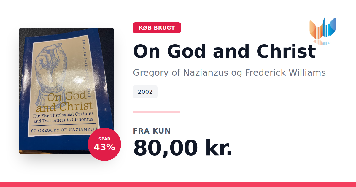 Lige nu kan du købe "On God and Christ" af Gregory of Nazianzus og Frederick Williams til kun 80,00 kr. Du sparer hele 43% af nyprisen! Bogen du ser her er brugt, og i god stand. Vi har i øjeblikket kun et enkelt eksemplar til salg af "On God and Christ", så slå til mens du kan!