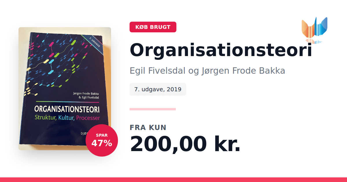 "Organisationsteori" fra 2019 af Egil Fivelsdal og Jørgen Frode Bakka tilbyder en grundig introduktion til centrale emner inden for organisationsforskning. Bogen undersøger, hvordan organisationens struktur, kultur og processer interagerer, og illustrerer teorierne gennem konkrete cases, som sætter fokus på både individet og organisationens samlede opbygning. Med udgangspunkt i cases fra den praktiske verden kombineres teoretiske perspektiver med virkelighedsnære eksempler, der belyser ledelse, strategi og forandringsprocesser. Denne opdaterede udgave giver læseren et solidt fundament for at forstå de dynamiske processer, der spiller en afgørende rolle i nutidens organisationer.