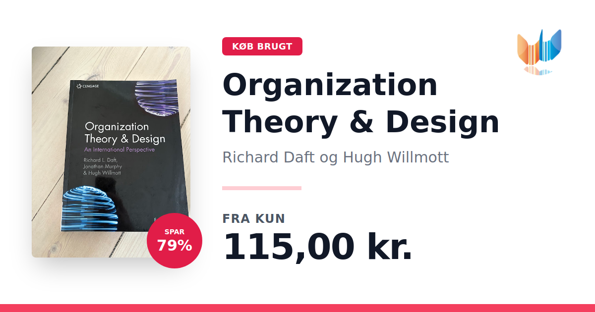 Lige nu kan du købe "Organization Theory & Design" af Richard Daft og Hugh Willmott til kun 115,00 kr. Du sparer hele 79% af nyprisen! Bogen du ser her er brugt, og i perfekt stand. Vi har i øjeblikket 3 eksemplarer til salg af "Organization Theory & Design", så husk at se de forskellige udgaver.