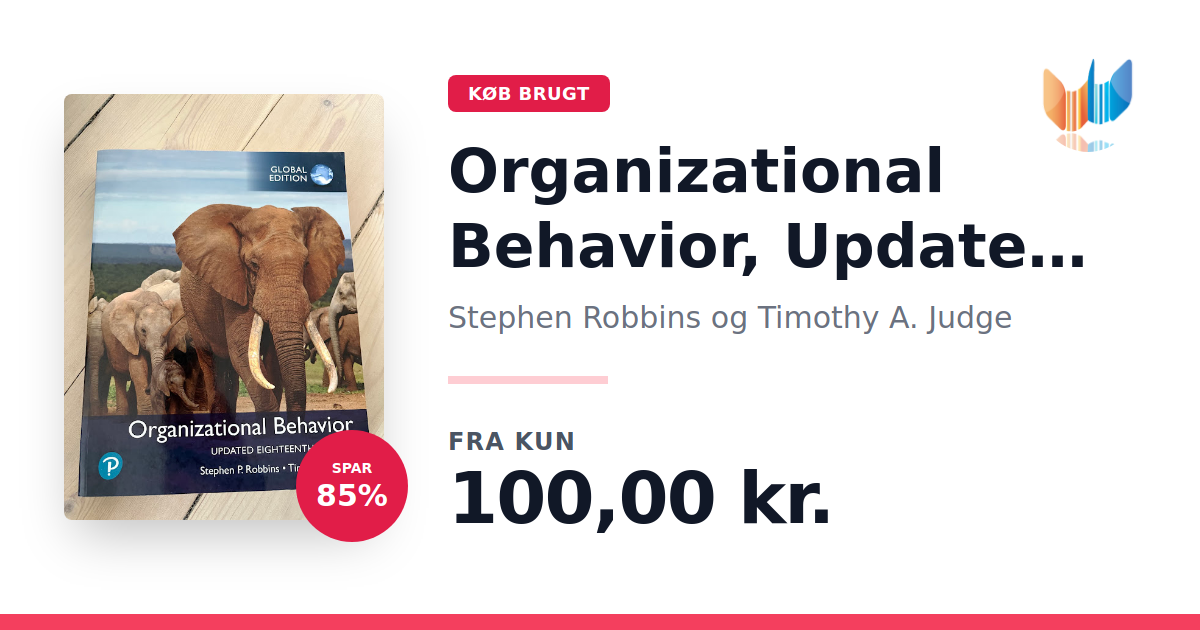 Lige nu kan du købe "Organizational Behavior, Updated Global Edition" af Stephen Robbins og Timothy A. Judge til kun 100,00 kr. Du sparer hele 85% af nyprisen! Bogen du ser her er brugt, og i perfekt stand. Vi har i øjeblikket kun et enkelt eksemplar til salg af "Organizational Behavior, Updated Global Edition", så slå til mens du kan!