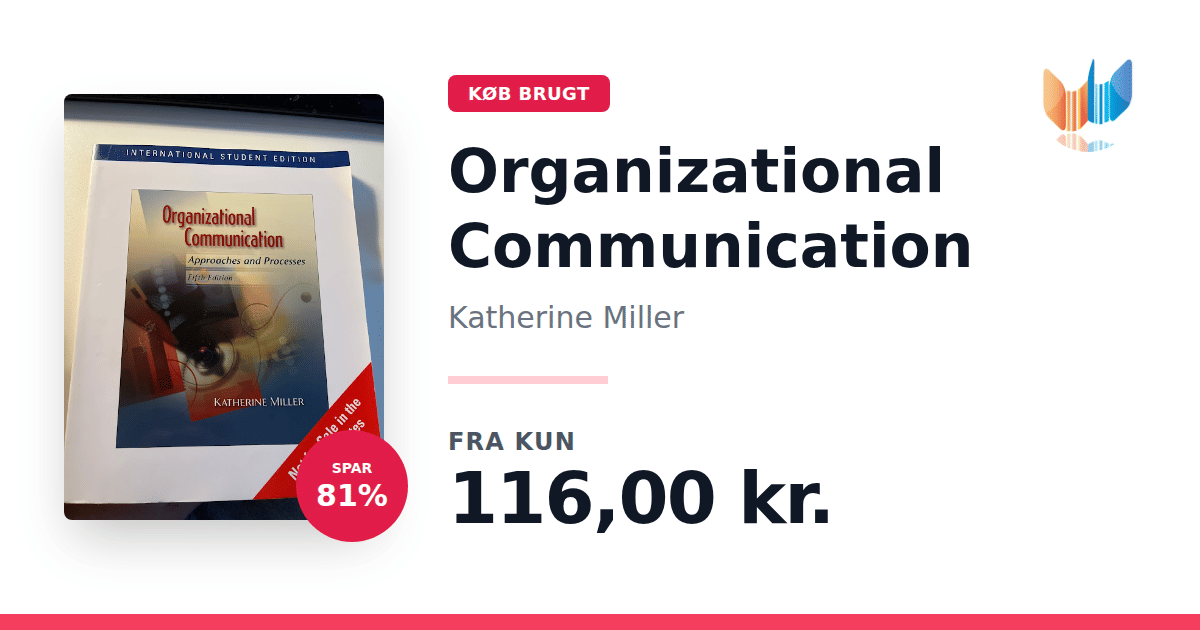 Organizational Communication: Approaches and Processes, 5. udgave, giver en dybdegående introduktion til, hvordan kommunikation former og understøtter organisationers struktur og kultur. Katherine Miller kombinerer både kommunikations- og ledelsesperspektiver i en sammenhængende fremstilling, der klæder læseren på til at forstå komplekse processer internt i virksomheder og institutioner. Med en klar og engagerende skrivestil ledsages teorien af talrige eksempler og cases, der illustrerer, hvordan principperne anvendes i praksis. Bogen på 336 sider fungerer som et uundværligt værktøj for studerende og praktikere, der ønsker en overskuelig og levende indføring i organisatorisk kommunikation.