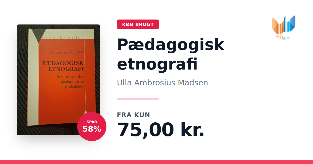 Lige nu kan du købe "Pædagogisk etnografi" af Ulla Ambrosius Madsen til kun 75,00 kr. Du sparer hele 58% af nyprisen! Bogen du ser her er brugt, og i god stand. Vi har i øjeblikket 2 eksemplarer til salg af "Pædagogisk etnografi", så husk at se de forskellige udgaver.