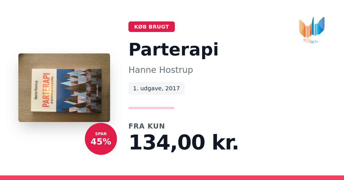 Lige nu kan du købe "Parterapi" af Hanne Hostrup til kun 134,00 kr. Du sparer hele 45% af nyprisen! Bogen du ser her er brugt, og i perfekt stand. Vi har i øjeblikket kun et enkelt eksemplar til salg af "Parterapi", så slå til mens du kan!