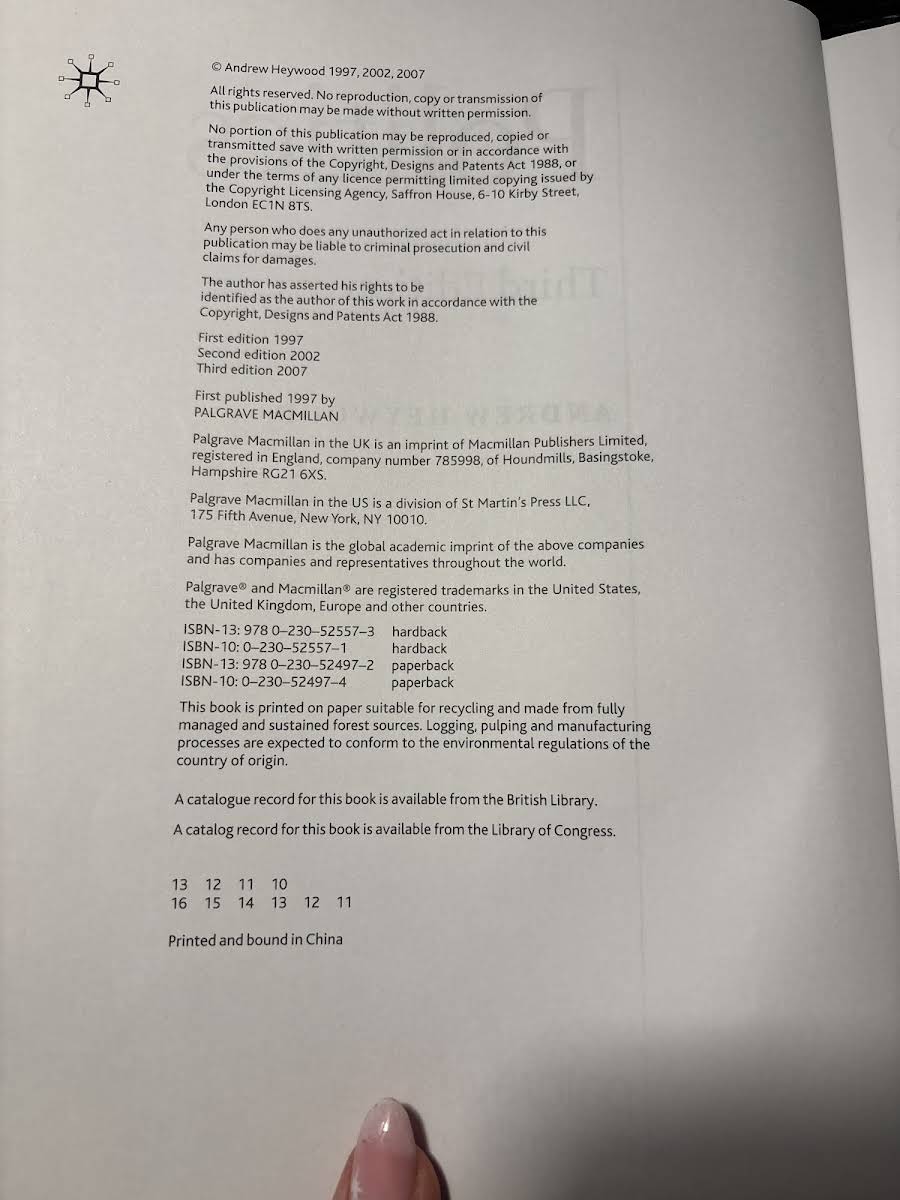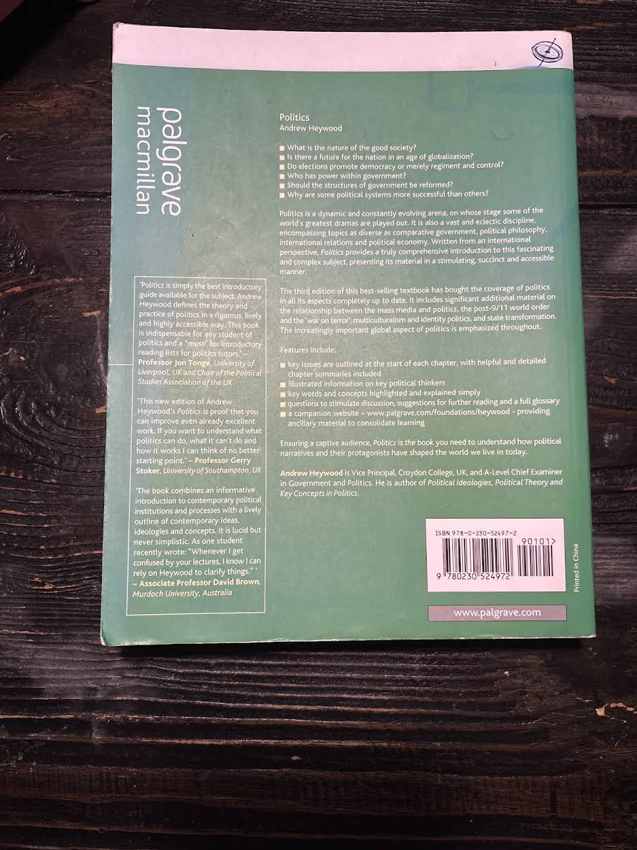 Politics, Third Edition by Andrew Heywood is a concise and engaging introduction to the study of politics from an international perspective. This edition offers a comprehensive overview, making complex theories and ideas accessible to a wide audience. The text presents new developments in the political landscape, including a dedicated chapter on the role of mass media and political communication. It also incorporates substantial new material addressing contemporary challenges such as the War on Terror, the rise of identity politics, multiculturalism, and the transformation of state structures. Published by Palgrave Macmillan in 2007, this 512-page paperback edition continues to serve as an essential resource for anyone seeking to understand modern politics in a global context.
