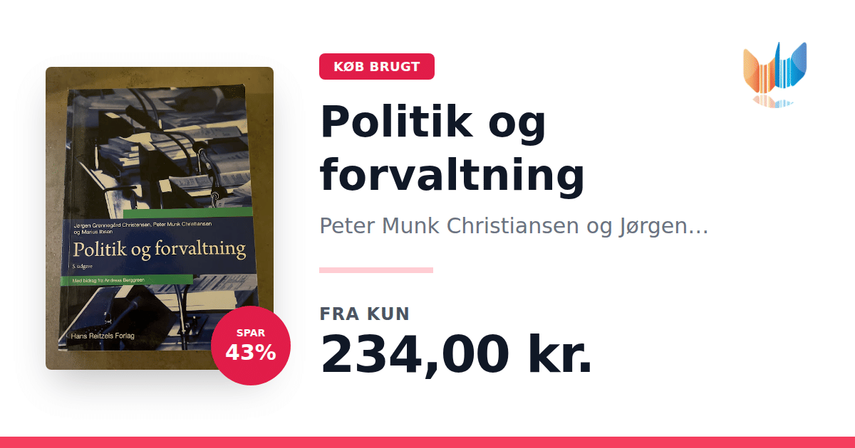 Lige nu kan du købe "Politik og forvaltning" af Peter Munk Christiansen og Jørgen Grønnegård Christensen til kun 234,00 kr. Du sparer hele 43% af nyprisen! Bogen du ser her er brugt, og i perfekt stand. Vi har i øjeblikket 2 eksemplarer til salg af "Politik og forvaltning", så husk at se de forskellige udgaver.