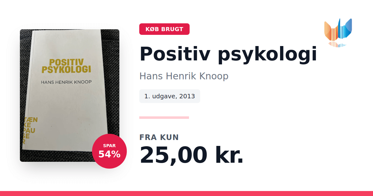 Lige nu kan du købe "Positiv psykologi" af Hans Henrik Knoop til kun 25,00 kr. Du sparer hele 54% af nyprisen! Bogen du ser her er brugt, og i perfekt stand. Vi har i øjeblikket kun et enkelt eksemplar til salg af "Positiv psykologi", så slå til mens du kan!
