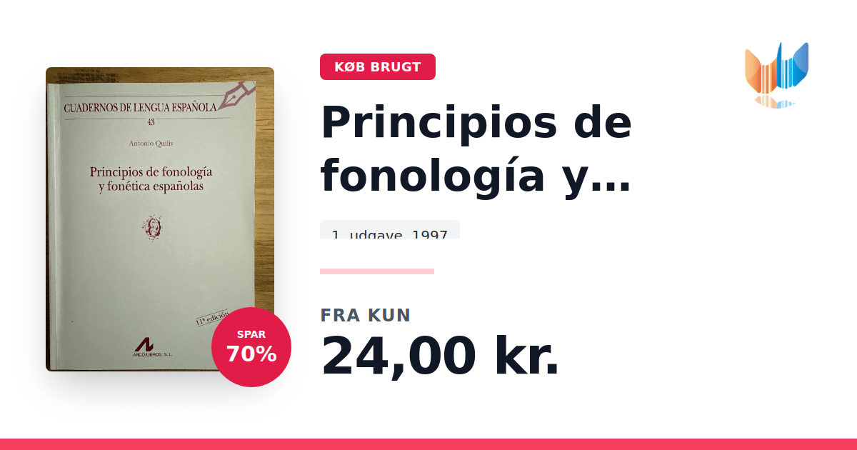 Lige nu kan du købe "Principios de fonología y fonética españolas" til kun 24,00 kr. Du sparer hele 70% af nyprisen! Bogen du ser her er brugt, og i perfekt stand. Vi har i øjeblikket kun et enkelt eksemplar til salg af "Principios de fonología y fonética españolas", så slå til mens du kan!