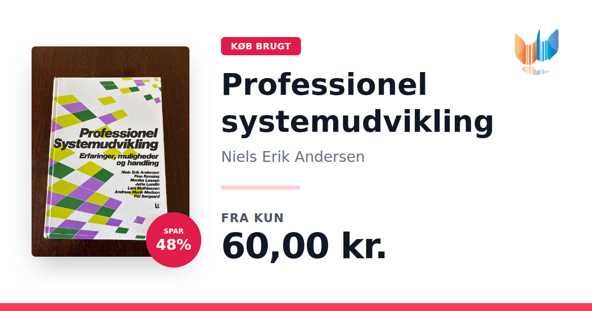 Lige nu kan du købe "Professionel systemudvikling" af Niels Erik Andersen til kun 60,00 kr. Du sparer hele 48% af nyprisen! Bogen du ser her er brugt, og i god stand. Vi har i øjeblikket kun et enkelt eksemplar til salg af "Professionel systemudvikling", så slå til mens du kan!