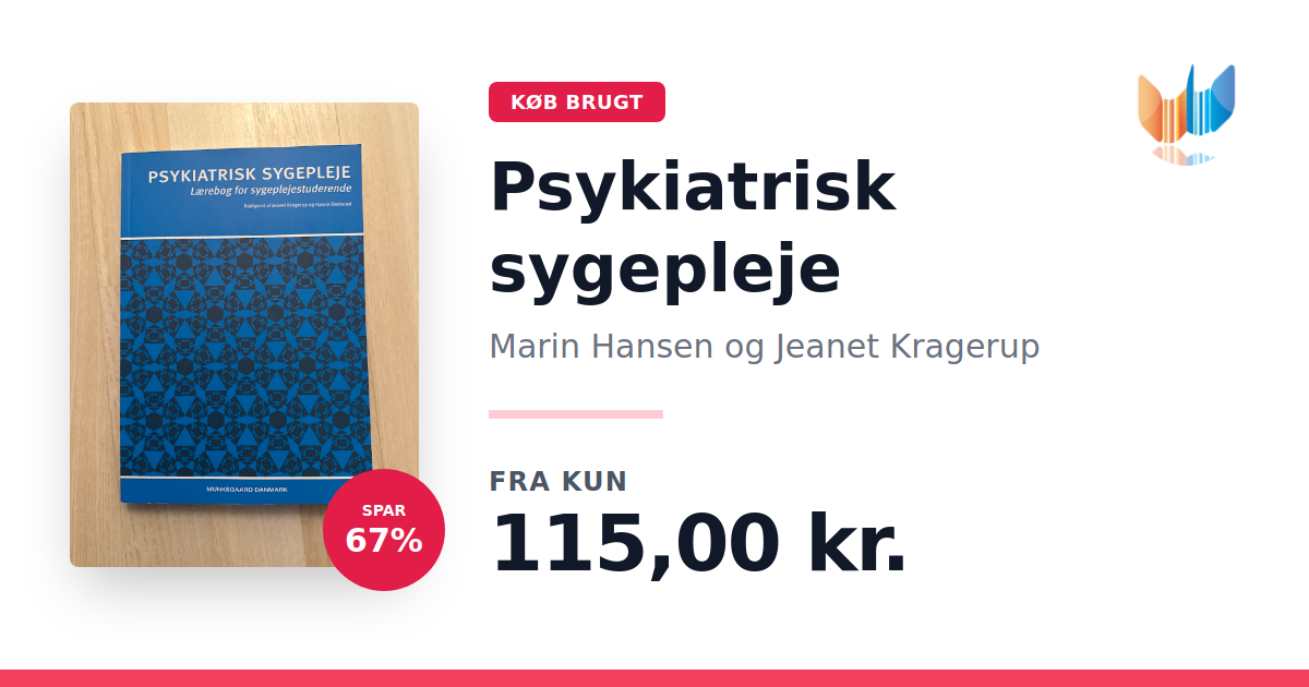 Lige nu kan du købe "Psykiatrisk sygepleje" af Marin Hansen og Jeanet Kragerup til kun 115,00 kr. Du sparer hele 67% af nyprisen! Bogen du ser her er brugt, og i perfekt stand. Vi har i øjeblikket 2 eksemplarer til salg af "Psykiatrisk sygepleje", så husk at se de forskellige udgaver.