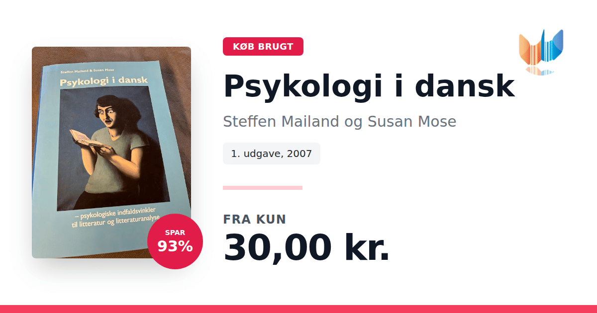 Lige nu kan du købe "Psykologi i dansk" af Steffen Mailand og Susan Mose til kun 30,00 kr. Du sparer hele 93% af nyprisen! Bogen du ser her er brugt, og i god stand. Vi har i øjeblikket kun et enkelt eksemplar til salg af "Psykologi i dansk", så slå til mens du kan!