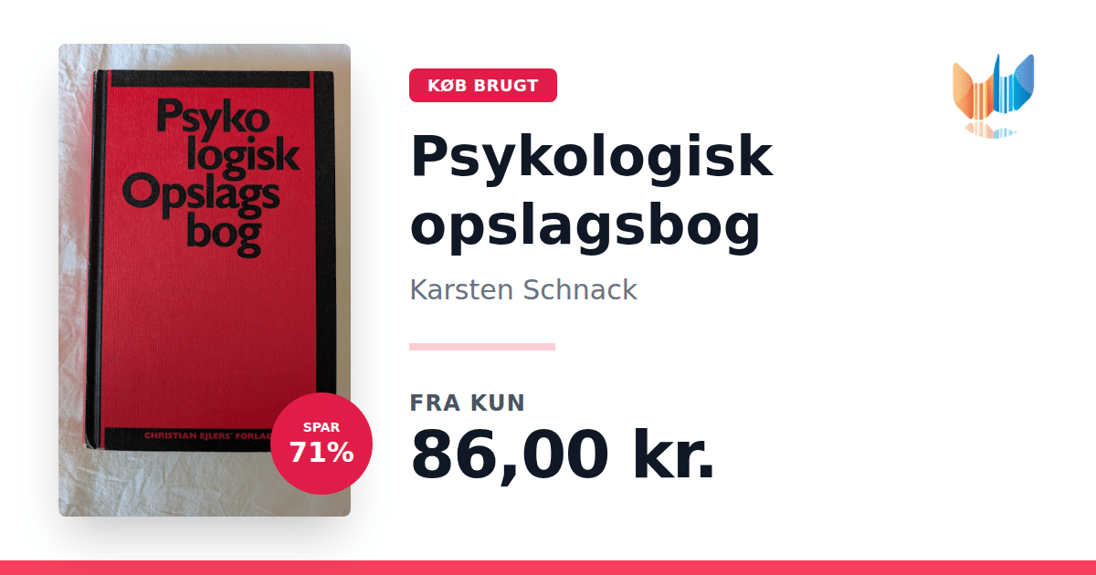 Lige nu kan du købe "Psykologisk opslagsbog" af Karsten Schnack til kun 86,00 kr. Du sparer hele 71% af nyprisen! Bogen du ser her er brugt, og i god stand. Vi har i øjeblikket 2 eksemplarer til salg af "Psykologisk opslagsbog", så husk at se de forskellige udgaver.