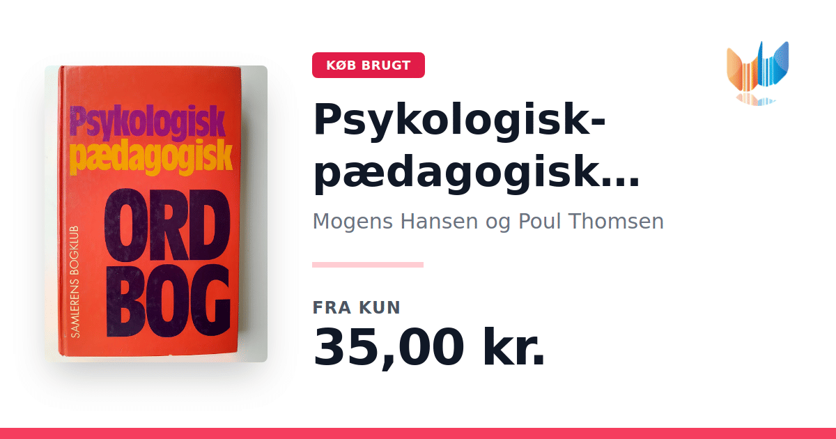 Lige nu kan du købe "Psykologisk-pædagogisk ordbog" af Mogens Hansen og Poul Thomsen til kun 35,00 kr. Bogen du ser her er brugt, og i god stand. Vi har i øjeblikket 6 eksemplarer til salg af "Psykologisk-pædagogisk ordbog", så husk at se de forskellige udgaver.