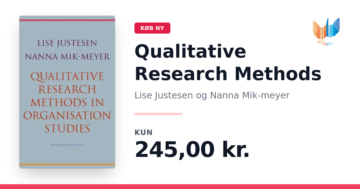 Qualitative Research Methods in Organisation Studies introducerer studerende og forskere til de fire mest anvendte kvalitative metoder: interviews, fokusgrupper, deltagerobservation og dokumentstudier. Bogen fungerer som en praktisk metodevejledning målrettet organisationstudier. Hver metode sættes i perspektiv med tre centrale teoretiske tilgange - realisme, fænomenologi og konstruktivisme - for at give en dybdegående forståelse af de underliggende antagelser i kvalitative analyser. Metoderne illustreres gennem autentiske cases inden for HRM, marketing, CSR og performanceaudit. Efter hvert kapitel præsenteres praktiske øvelser, der egner sig til gruppearbejde og klasseundervisning. Øvelserne hjælper med at omsætte teori til praksis og styrker den studerendes metodevalg. 1. udgave fra 2012, udgivet af Hans Reitzels Forlag, omfatter 153 sider i paperbackformat. Forfatterne Nanna Mik-Meyer og Lise Justesen er lektorer ved Copenhagen Business School og har begge omfattende erfaring med forskning og undervisning i kvalitative metoder.
