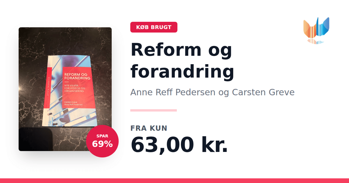 Lige nu kan du købe "Reform og forandring" af Anne Reff Pedersen og Carsten Greve til kun 63,00 kr. Du sparer hele 69% af nyprisen! Bogen du ser her er brugt, og i god stand. Vi har i øjeblikket 2 eksemplarer til salg af "Reform og forandring", så husk at se de forskellige udgaver.