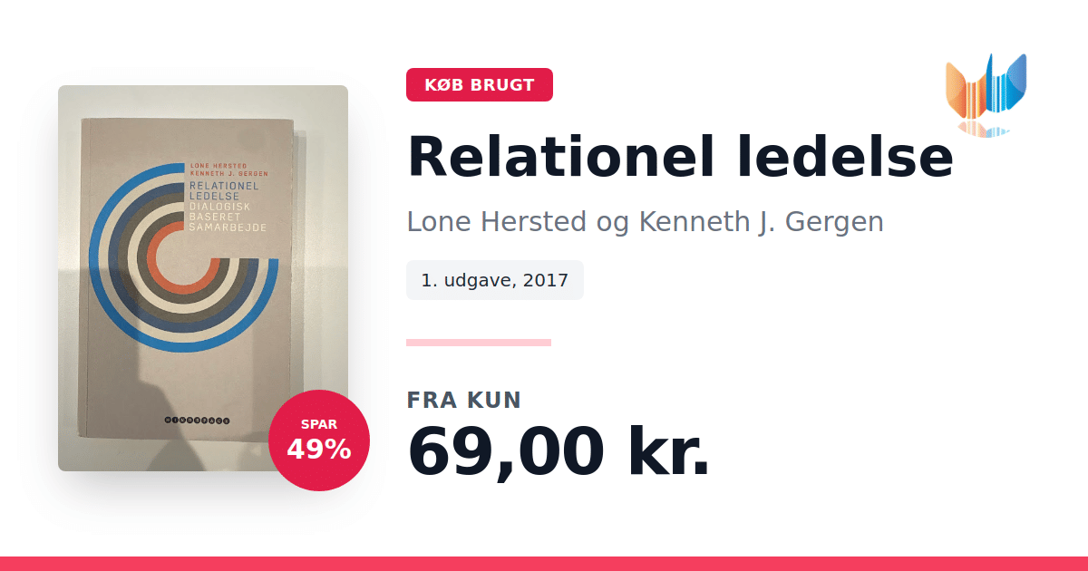 Lige nu kan du købe "Relationel ledelse" af Lone Hersted og Kenneth J. Gergen til kun 69,00 kr. Du sparer hele 49% af nyprisen! Bogen du ser her er brugt, og i perfekt stand. Vi har i øjeblikket kun et enkelt eksemplar til salg af "Relationel ledelse", så slå til mens du kan!