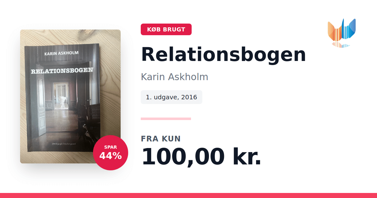 Lige nu kan du købe "Relationsbogen" af Karin Askholm til kun 100,00 kr. Du sparer hele 44% af nyprisen! Bogen du ser her er brugt, og i perfekt stand. Vi har i øjeblikket kun et enkelt eksemplar til salg af "Relationsbogen", så slå til mens du kan!