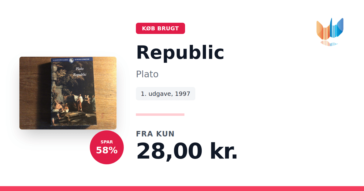 Lige nu kan du købe "Republic" af Plato til kun 28,00 kr. Du sparer hele 58% af nyprisen! Bogen du ser her er brugt, og i perfekt stand. Vi har i øjeblikket kun et enkelt eksemplar til salg af "Republic", så slå til mens du kan!