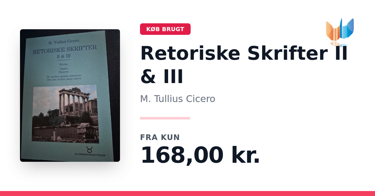 Lige nu kan du købe "Retoriske Skrifter II & III" af M. Tullius Cicero til kun 168,00 kr. Bogen du ser her er brugt, og i perfekt stand. Vi har i øjeblikket kun et enkelt eksemplar til salg af "Retoriske Skrifter II & III", så slå til mens du kan!