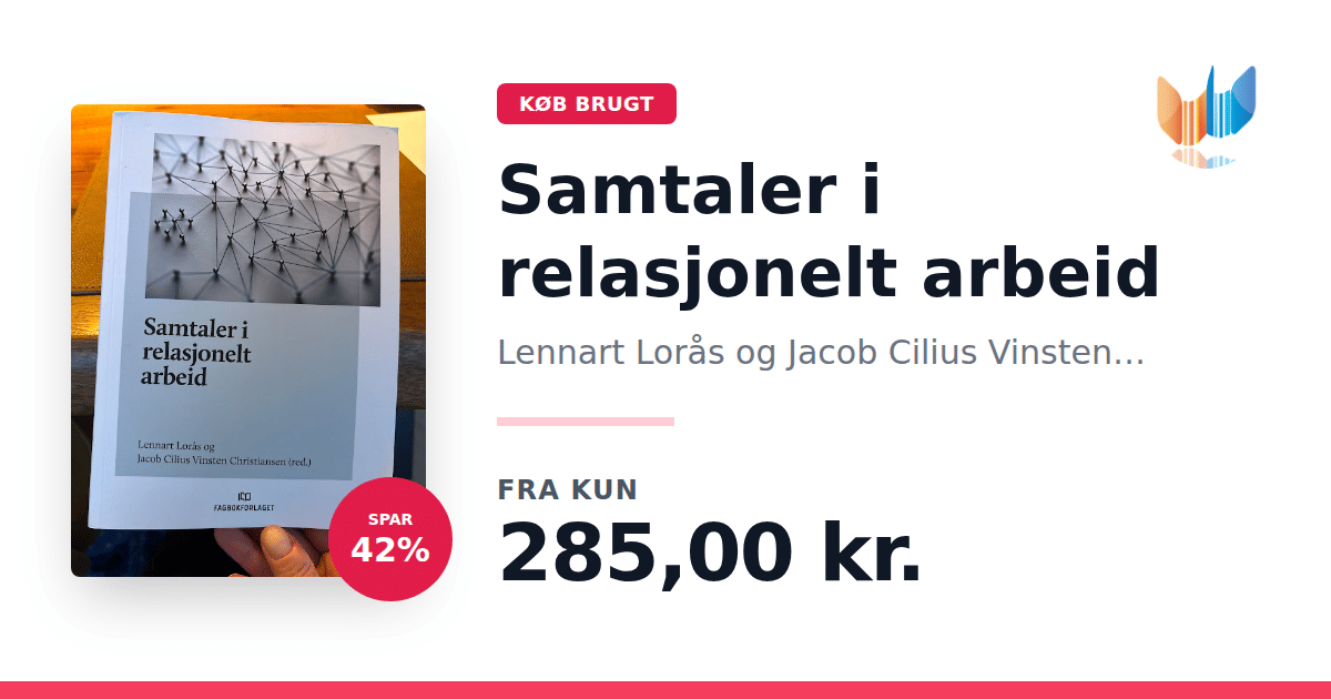 Lige nu kan du købe "Samtaler i relasjonelt arbeid" af Lennart Lorås og Jacob Cilius Vinsten Christiansen til kun 285,00 kr. Du sparer hele 42% af nyprisen! Bogen du ser her er brugt, og i perfekt stand. Vi har i øjeblikket kun et enkelt eksemplar til salg af "Samtaler i relasjonelt arbeid", så slå til mens du kan!